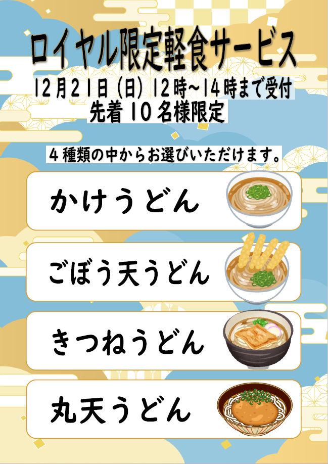 12月21日(日)ロイヤルルーム利用者限定で、先着10名様にうどんをプレゼントいたします。