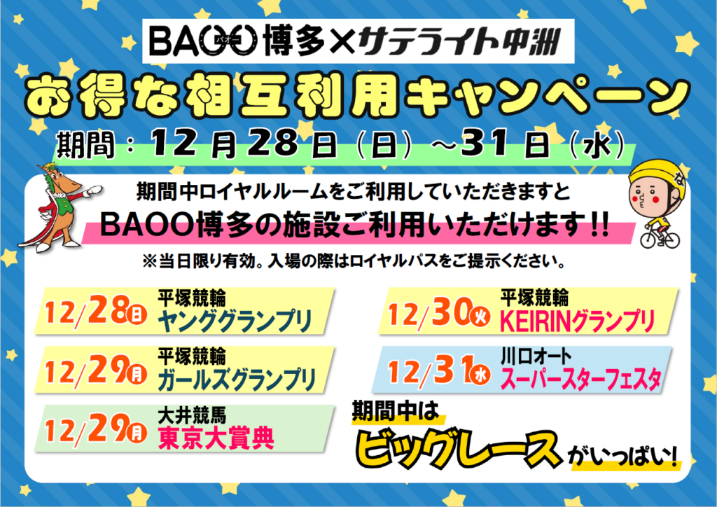 12月28日(日)~12月31日(水)の期間中、サテライト中洲🚴🏍のロイヤルルーム(有料席)を
