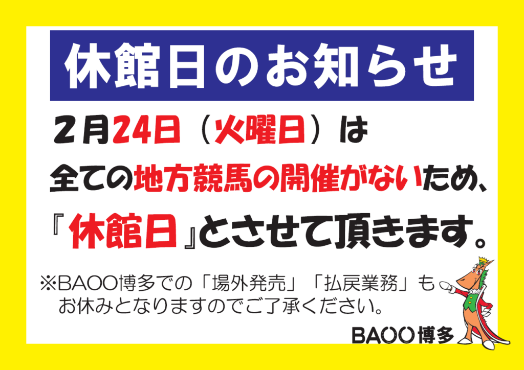 BAOO博多2月24日(火)はすべての地方競馬の開催がない為、休館日とさせていただきます。